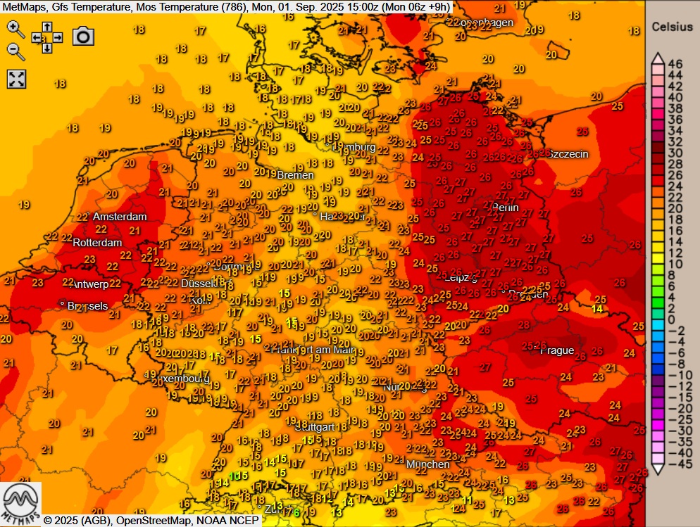 Die Lufttemperaturen am Montagnachmittag (15:00 Uhr) nach GFS: