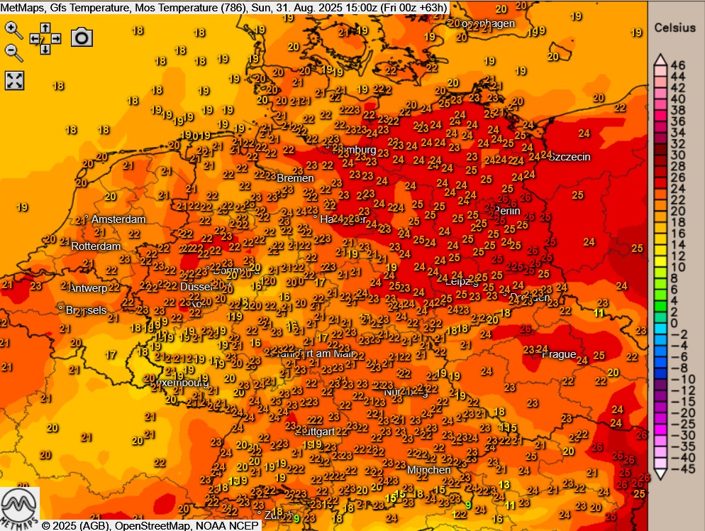 Die Karte zeigt die Luftemperaturen am Sonntagnachmittag (15 Uhr) nach GFS: