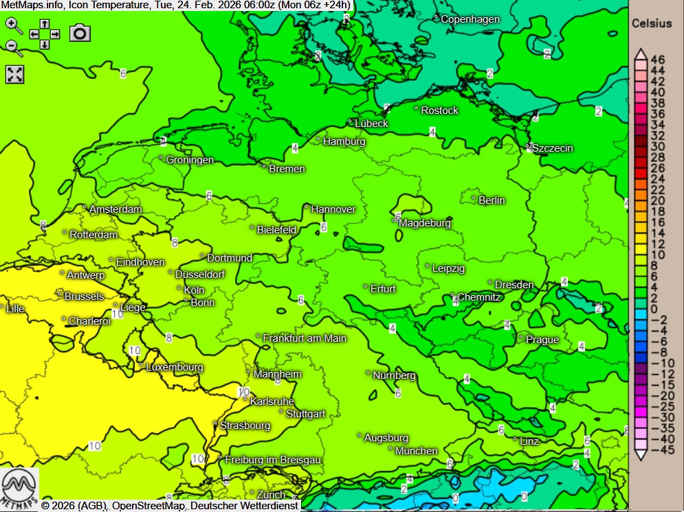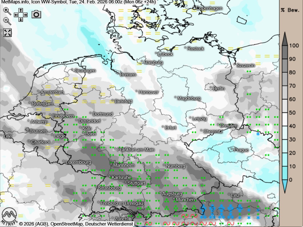 Die Wetter- / Temperaturkarte für Dienstagmorgen (06:00 Uhr) sowie die 24-Stunden-Regenmengen am Dienstag nach ICON: