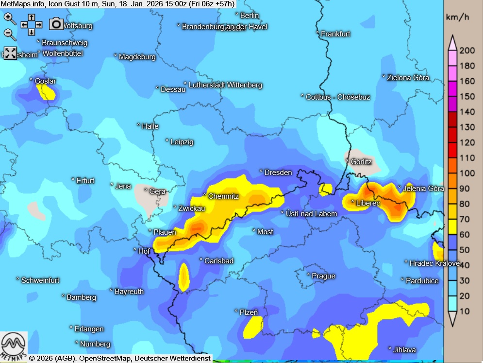 Die Temperatur- und Wetterkarte sowie die Böenkarte für den Südosten für Sonntagnachmittag nach ICON:
