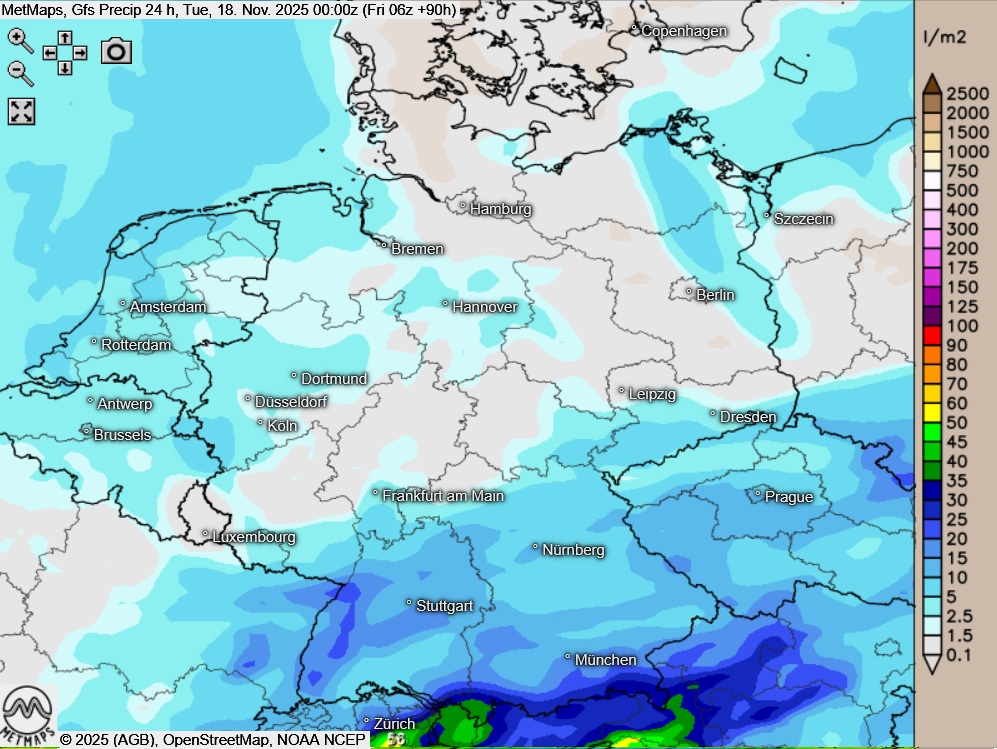 Die Strömungs- / Temperaturkarte für Montagfrüh sowie die 24-Stunden-Regenmengen am Montag nach GFS: