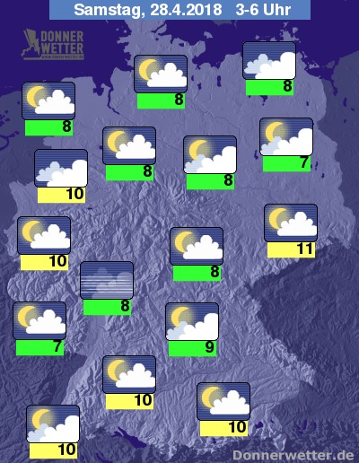 Am Samstag ziehen im Umfeld von Nord- und Ostsee überwiegend dichte Wolken durch, dabei bilden sich zeitweise Schauer. Einzelne Schauer und örtliche Gewitter entwickeln sich im Alpenvorland, im übrigen Bundesgebiet bleibt es bei teils heiterem, teils aufgelockertem Himmel trocken. Die Temperatur steigt auf kühle 12 Grad in Bremerhaven und bis auf 22 Grad in München.
