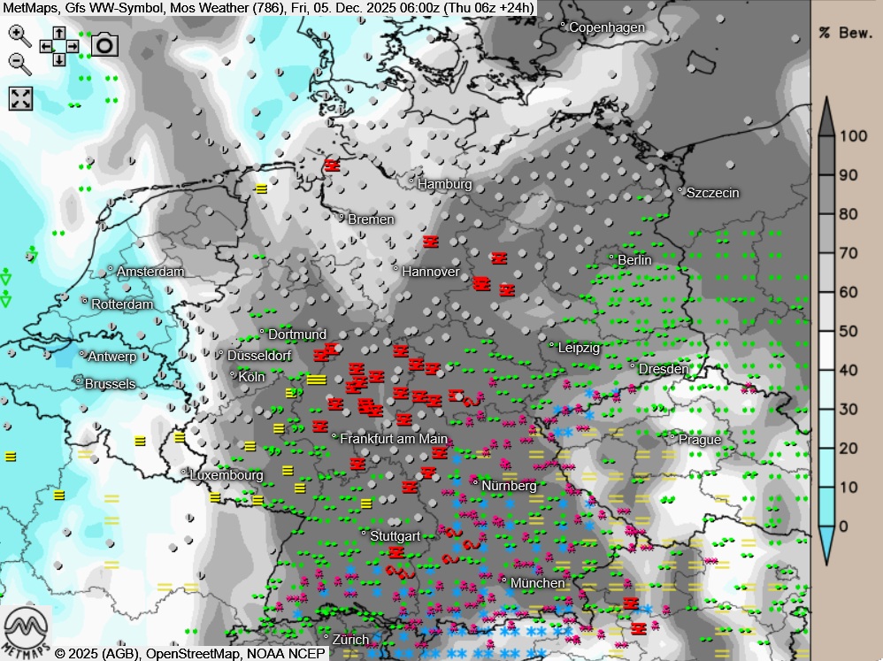 Am Freitag zeigt sich der Himmel über weiten Landesteilen stark bewölkt oder es ist bedeckt, im Süden bleibt es teils ganztägig nebelig-trüb. Im Osten fällt am Freitag zeitweise etwas Regen, im Südosten auch mit Schnee vermischt - hier besteht gebietsweise Glättegefahr durch gefrierenden Regen!