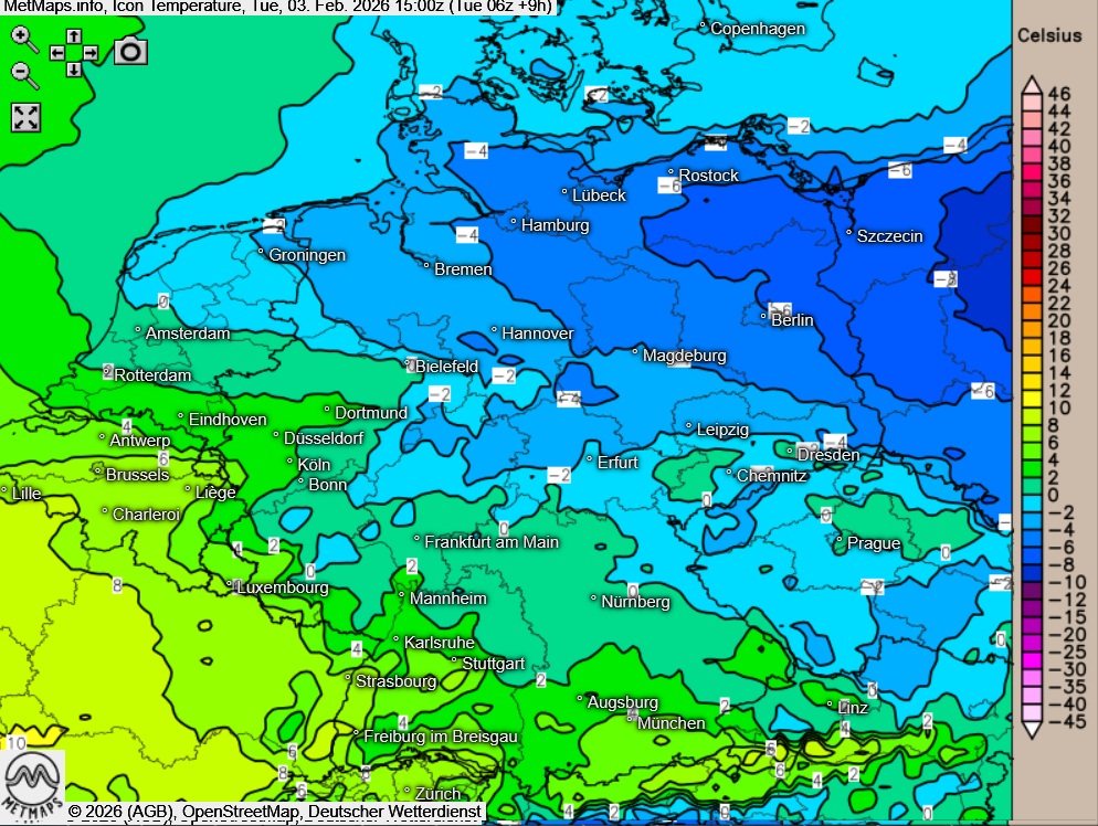 Die Temperaturkarte für 15:00 Uhr, die Wetterkarte für 17:00 Uhr mit Eisregengebieten (rot) für 17:00 Uhr sowie die Sechs-Stunden-Schneemengen bis 21:00 Uhr nach ICON: