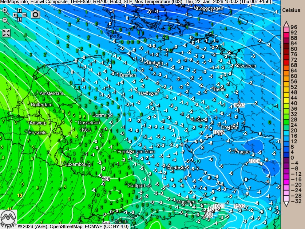 Die Temperaturen erreichen im Dauernebel teils nur Höchstwerte um Um -6 Grad, die mildesten Werte werden mit +6 Grad am Niederrhein erreicht.