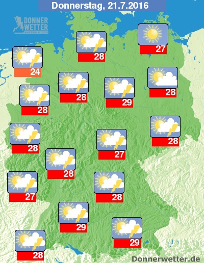 Am Donnerstag scheint zwischen der Ostseeküste und Berlin-Brandenburg häufig die Sonne und es bleibt hier weitgehend trocken. Im übrigen Bundesgebiet zeigen sich zum Teil Auflockerungen, jedoch ziehen oft auch dichte Wolken durch, dabei sind verbreitet Schauer und teils kräftige Gewitter möglich. Die Temperatur steigt auf 24 Grad an der Nordsee und bis 29 Grad in Magdeburg.