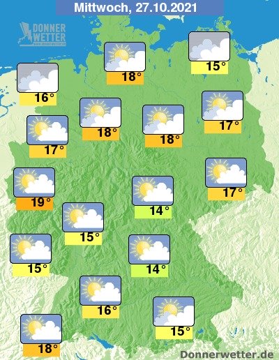 Am Mittwoch ist es im Norden und Osten meist trüb oder stark bewölkt, im übrigen Land ist es hingegen häufig heiter, hier und da allerdings ebenfalls stark bewölkt. Es bleibt landesweit trocken bei 14 Grad in Mittelfranken und bis zu 19 Grad in der Kölner Bucht. An der Nordsee weht ein oft stürmischer Wind.