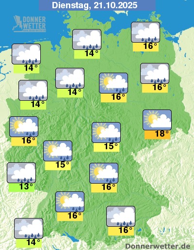 Am Dienstag zieht oft starke Bewölkung durch, dazwischen können sich aber auch von Zeit zu Zeit Auflockerungen zeigen. Es bilden sich allerdings gebietsweise Schauer. Die Temperatur erreicht 13 Grad im Saargau und bis 18 Grad in der Niederlausitz.