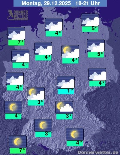 In der Nacht zum Dienstag zieht einerseits im Norden, andererseits vom Osten bis in den Südosten Deutschlands ein Niederschlagsgebiet mit Schnee, Schneeregen oder Regen, dazu kann es erheblich glatt werden! Im übrigen Land ist es überwiegend stark, teils auch aufgelockert bewölkt und weitgehend trocken. Die Temperatur sinkt auf 3 Grad in Köln und bis -3 Grad im Raum München.