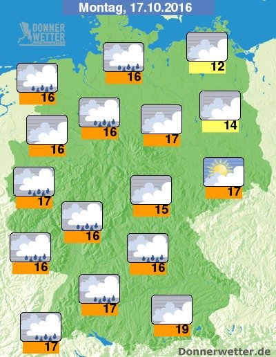 Am Montag ist es im Osten teils noch aufgelockert bewölkt, sonst zieht jedoch überwiegend dichte Bewölkung durch bei nur seltenen Auflockerungen, dazu fällt vor über der Westhälfte gebietsweise Regen. Im Nordosten und Osten bleibt es hingegen meist trocken. Es werden 12 bis 19 Grad erreicht.