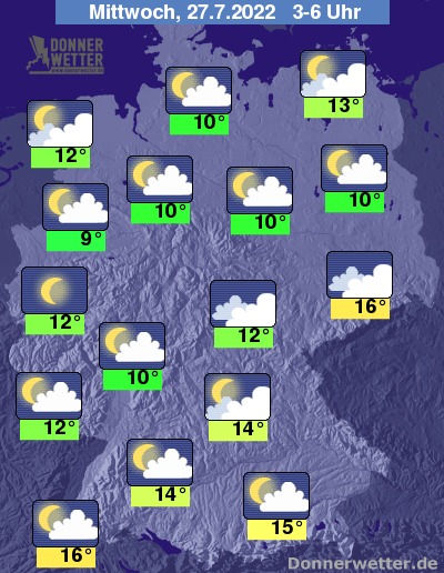 In der folgenden Nacht zieht zeitweise starke Bewölkung durch, Regen fällt dabei aber nicht. Häufig ist es auch nur locker bis wechselnd bewölkt und teils auch sternenklar. Die Temperatur sinkt auf 16 Grad in Freiburg und etwa 9 Grad in Meppen.