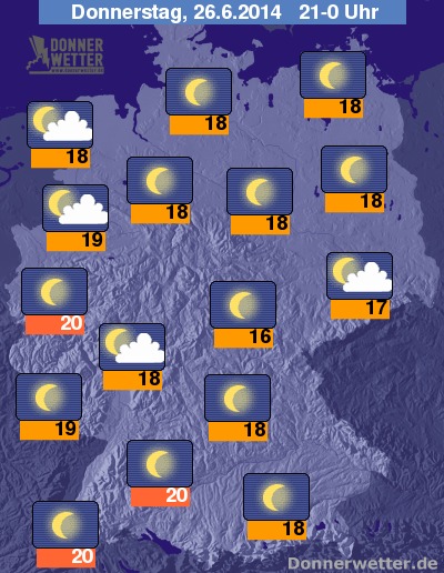 Am Abend erwartet uns häufig ein klarer Himmel und es ziehen nur gebietsweise dichtere Wolken durch, diese bringen jedoch keinen Regen. Die abendlichen Temperaturen liegen bei rund 20 Grad in Köln und etwa 16 Grad am Thüringer Wald.