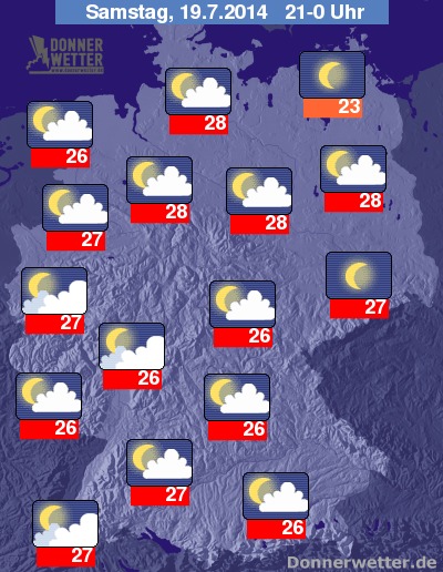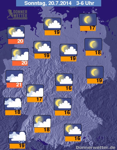 In der Nacht zum Sonntag ist es ganz nach Osten hin meist sternenklar, sonst zieht häufig aufgelockerte Bewölkung durch, besonders nach Westen und Südwesten hin werden die Wolken auch dichter und gebietsweise können sich auch schon die ersten Gewitter bilden, sonst bleibt es aber noch trocken. Die Tiefstwerte erreichen tropische 21 Grad in Köln-Bonner-Raum und etwa 16 Grad an der Fränkischen Alb.