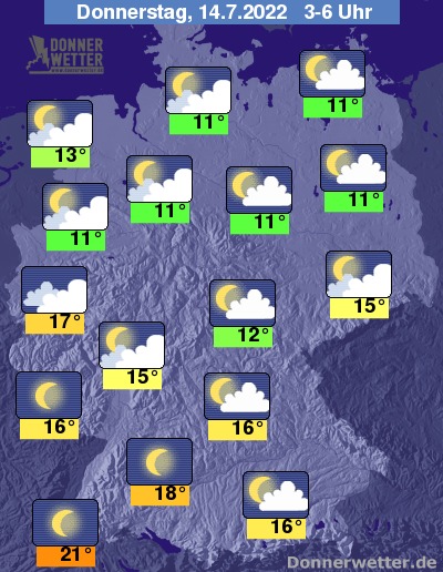 In der folgenden Nacht ist der Himmel über dem Süden meist locker bewölkt bis sternenklar. Im übrigen Land ist es teils locker, oft aber auch wechselnd bis stark bewölkt, dazu bleibt es trocken. Die Temperatur sinkt auf 21 Grad in Freiburg und 11 Grad in Berlin.