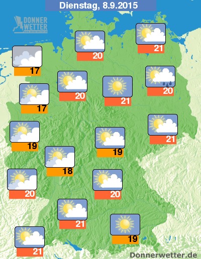 Am Dienstag ist es häufig heiter bis sonnig, vor allem im Westen, Nordwesten und Osten des Landes ziehen jedoch auch teils dichte Wolken durch, dabei sind im Osten einzelne Schauer möglich, sonst bleibt es jedoch weitgehend trocken. Die Temperatur steigt auf 17 Grad entlang der Ems und bis auf spätsommerliche 21 Grad im Oberrheingraben.