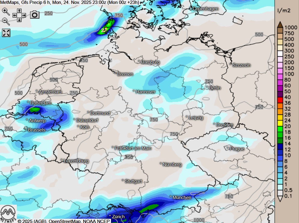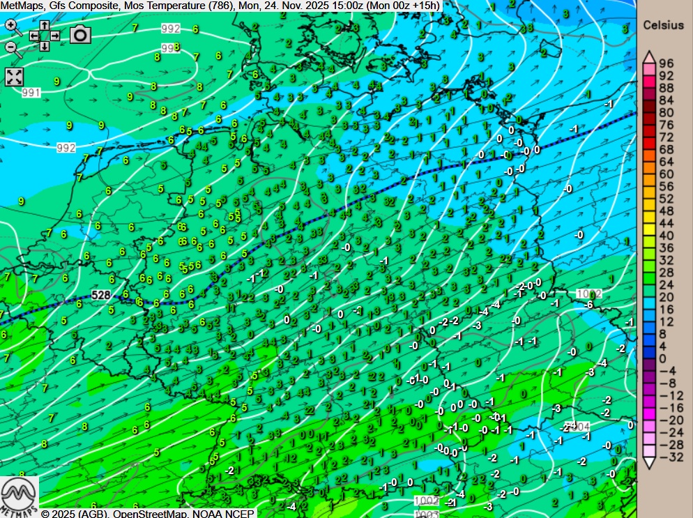 Die Strömungs- / Temperaturkarte für Montagnachmittag (15:00 Uhr) sowie die 6-Stunden-Regenmengen bis 23:00 Uhr nach GFS: