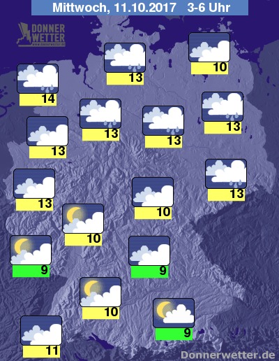 Am Mittwoch setzt sich im Süden und im weiteren Verlauf auch im Westen heiteres und trockenes Herbstwetter durch. Im übrigen Land bleibt es jedoch noch verbreitet stark bewölkt und es fällt vor allem im Norden auch zeitweise Regen. Die Temperatur erreicht 14 Grad im Grabfeld und bis 20 Grad im Breisgau.