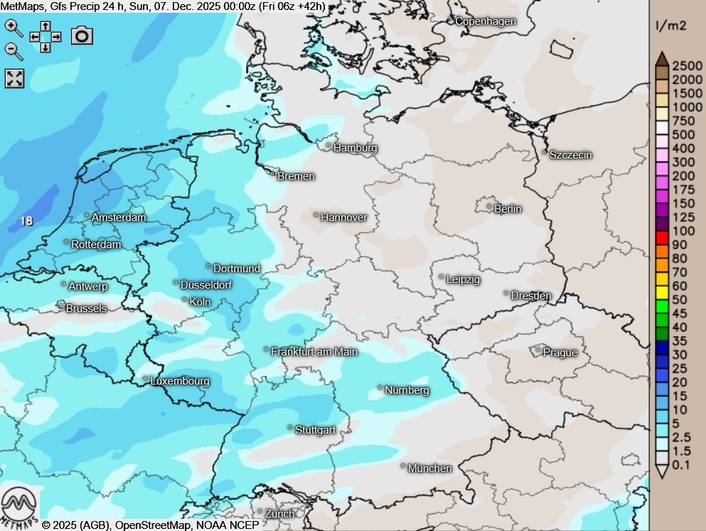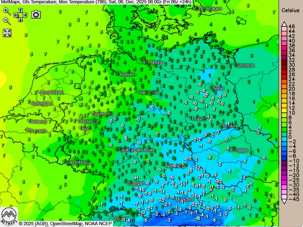 Die Temperaturkarte für den Nikolausmorgen (06:00 Uhr) sowie die 24-Stunden-Regenmengen für Samstag nach  GFS: