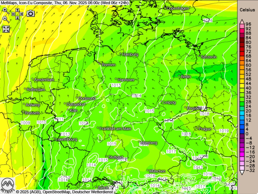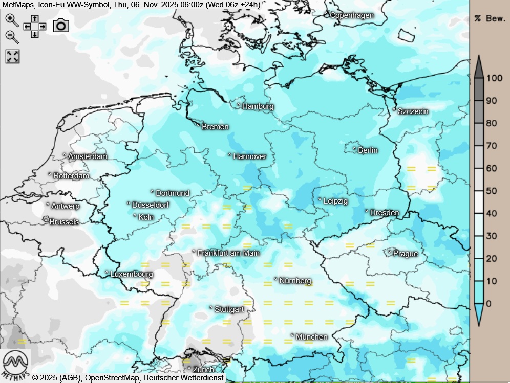Am Donnerstag zeigt sich der Himmel über dem Westen und Nordwesten lokal wolkig, es bleibt aber trocken. Im Süden Deutschlands kann sich vor allem in den Niederungen lokal zäher Nebel halten, teils ist es auch ganztägig trüb. Sonst ist es heute nach Nebelauflösung heiter oder die Sonne scheint von einem wolkenlosen Himmel.