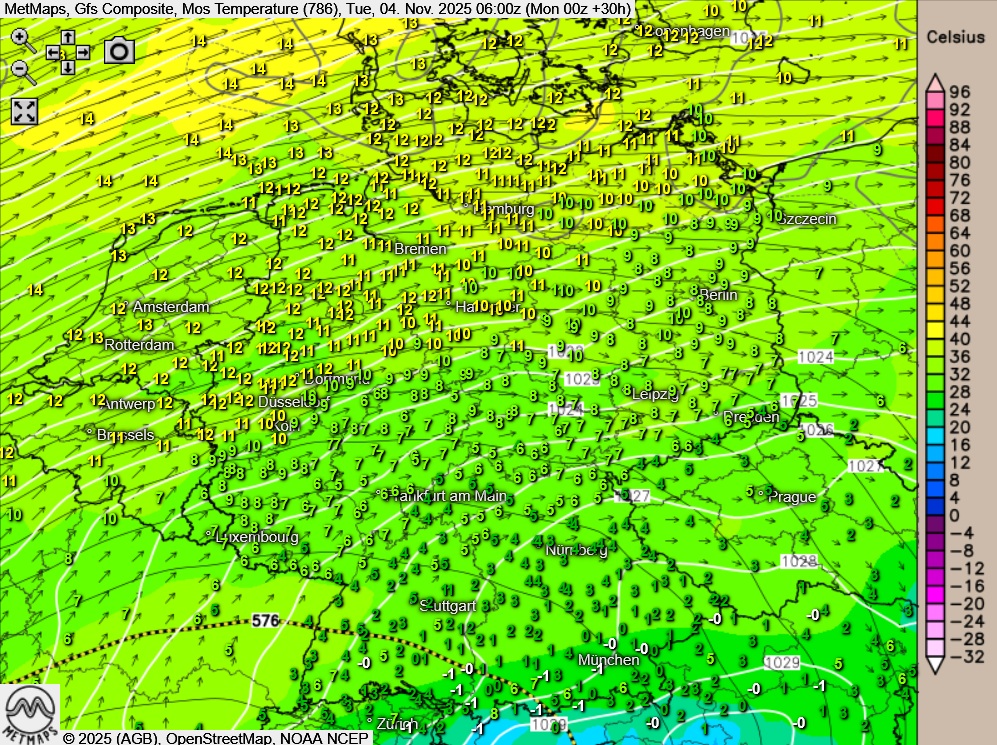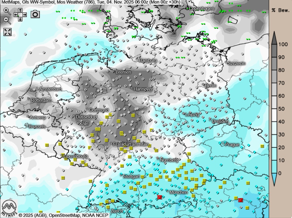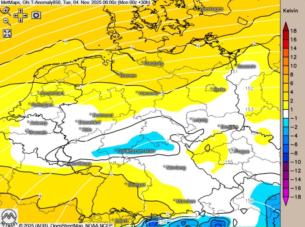 Die Temperatur- und Wetterkarte sowie die Temperaturanomalie für Dienstagfrüh (06:00 Uhr) nach GFS:
