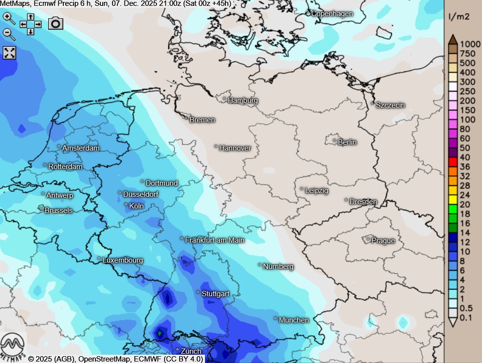 Die Temperatur- und Wetterkarte für Sonntagnachmittag sowie die Sechs-Stunden-Regenmengen bis 21:00 Uhr nach ECMWF: