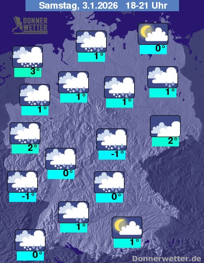 Heute Abend ziehen häufig kompakte Wolken durch und es können sich wiederholt Schnee- oder Schneeregenschauer bilden. Dazwischen sind auch Auflockerungen möglich. Vor allem im Südosten und an der Ostsee zeigt sich der Himmel oft nur locker bewölkt, hier bleibt es meist trocken. Die Temperatur liegt bei -1 Grad in Jena und etwa 3 Grad in Cuxhaven.