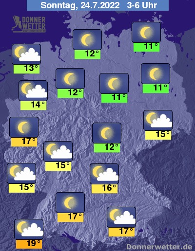 In der Nacht zum Sonntag klingen letzte Schauer an den Alpen rasch ab und es lockert hier auf. Im übrigen Bundesgebiet ist es schon verbreitet nur locker bewölkt und vor allem über der Nordosthälfte wird es meist sternenklar, dazu bleibt es trocken. Die Temperatur sinkt auf 19 Grad in Freiburg und 11 Grad in Neubrandenburg.