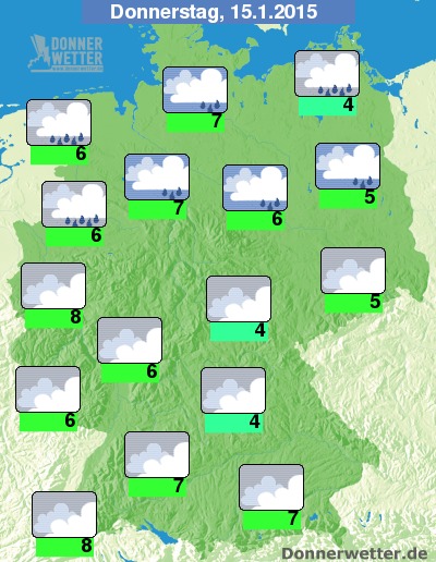 Heute bleibt die Wolkendecke verbreitet geschlossen, nur ganz vereinzelt kann es im Süden und Osten auch mal auflockern, hier bleibt es meist trocken, sonst fällt insbesondere im Norden aber häufiger und teils kräftiger Regen. Die Temperatur steigt auf 4 Grad an der Fränkischen Alb und bis 8 Grad in Aachen. Mit Ausnahme des Südens weht ein verbreitet frischer bis starker Wind mit möglichen Sturmböen, vereinzelt auch mit schweren Sturmböen. An den Küsten und auf den Bergen herrscht zum Teil Sturm mit teils orkanartigen Böen.