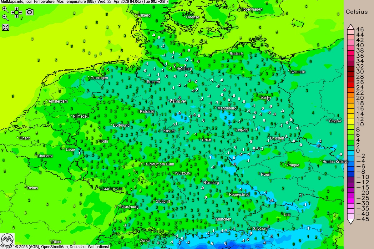 Lufttemperaturen Mittwochfrüh (04:00 Uhr) nach ICON