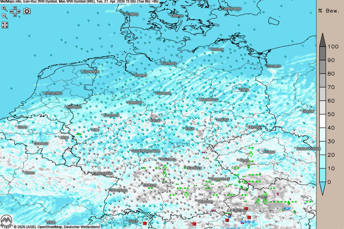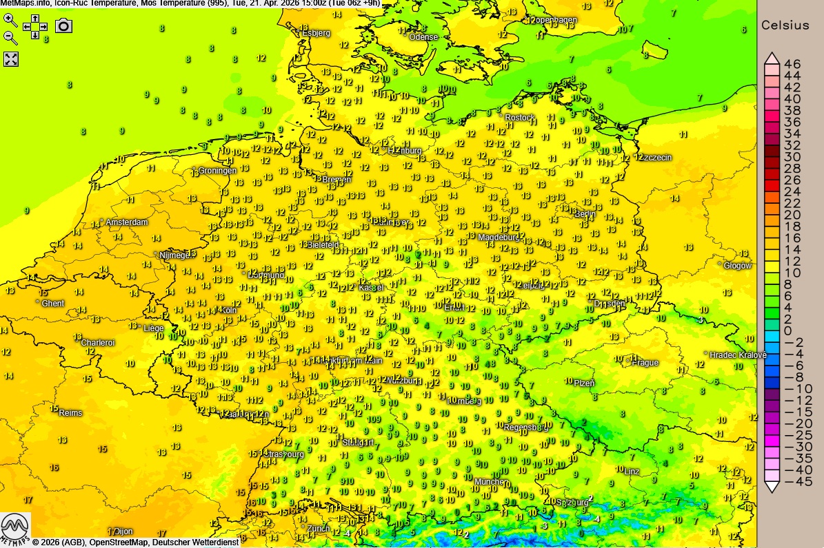 Die Wetter- und Temperaturkarte für 15:00 Uhr nach ICON-RUC: