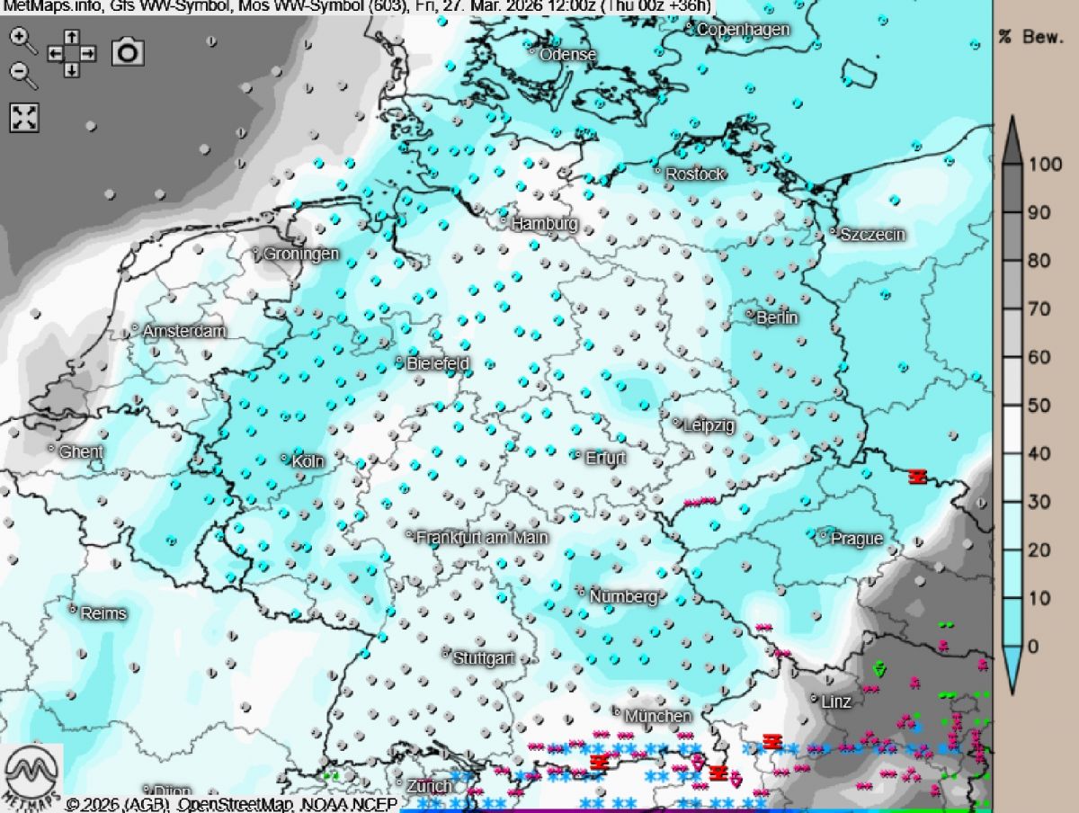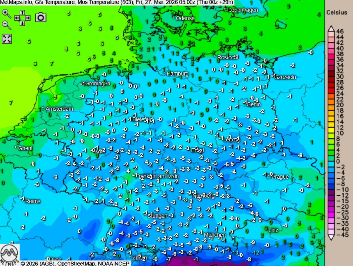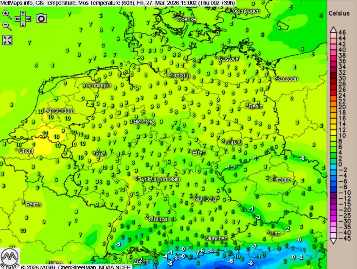 Die Temperaturkarte für Freitag (05:00 Uhr), die Wetterkarte für 12:00 Uhr sowie die Lufttemperaturen um 15:00 Uhr nach GFS:
