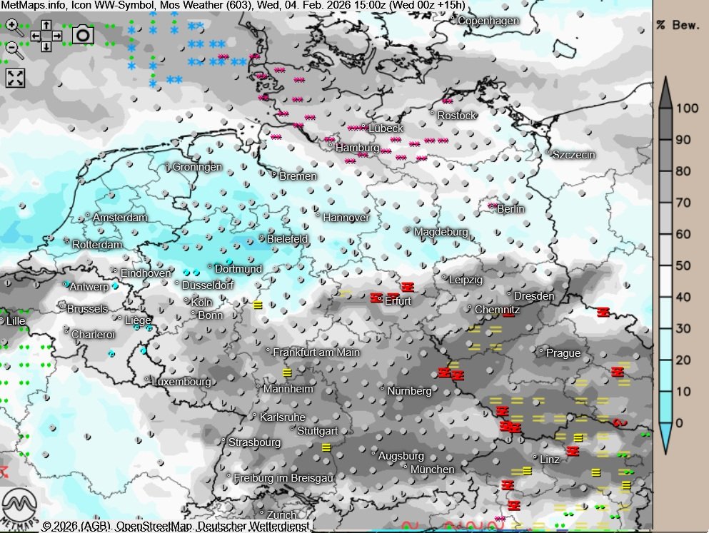 Die Wetter- und Temperaturkarte für Mittwochnachmittag (15:00 Uhr) nach ICON: