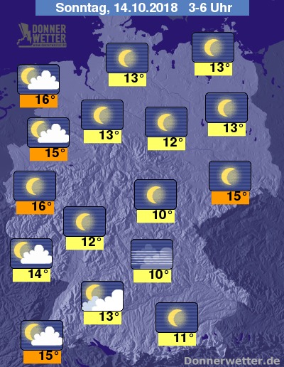 In der Nacht zum Sonntag zeigt sich der Himmel weitgehend sternenklar, lediglich in den westlichen und südwestlichen Landesteilen ziehen örtlich einige Wolken durch, dazu bleibt es trocken. Besonders in den Flussniederungen und in Tallagen bildet sich stellenweise Nebel. Die Temperatur sinkt auf 16 Grad an der Nordsee und bis 10 Grad im Thüringer Becken.