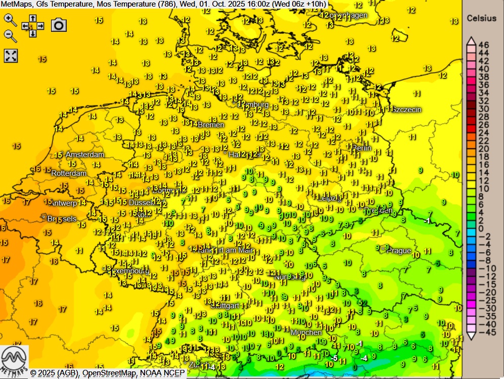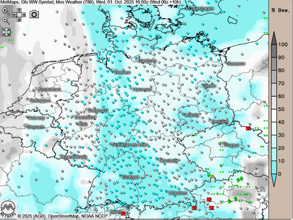 Die Temperatur- und Wetterkarte für Mittwochnachmittag (16:00 Uhr) nach GFS: