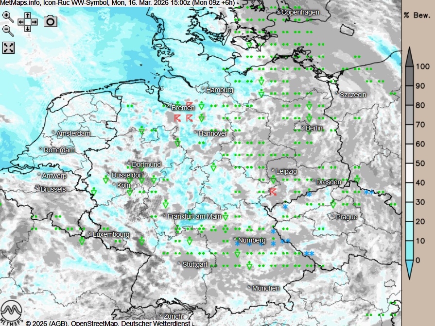 Die Wetter- und Temperaturkarte für 15:00 Uhr sowie die 6-Stunden-Regenmengen bis 21:00 Uhr nach ICON-RUC: