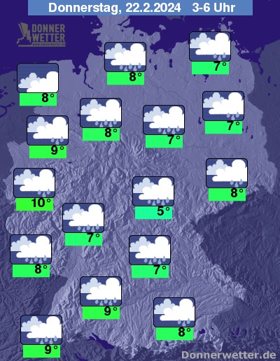 In den späteren Abendstunden ist der Himmel stark bewölkt oder es ist bedeckt, im Westen und Nordwesten setzt dabei Regen ein, der in der Nacht auch den Süden und Südosten erreicht. Von Westen und Südwesten frischt der Wind dabei zunehmend böig auf, in den Höhenlagen sind auch Sturm- oder schwere Sturmböen möglich.