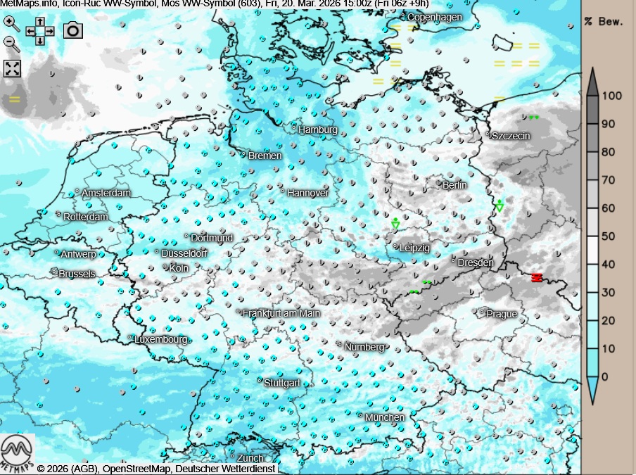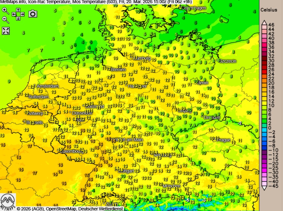 Die Temperatur- und Wetterkarte für Freitagnachmittag (15:00 Uhr) nach ICON-RUC:
