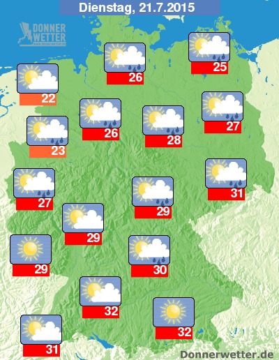 Am Dienstag bleibt es im Süden weitgehend heiter bis sonnig und trocken, sonst zeigt sich zwischen gebietsweise dichten Wolken zwar häufiger auch die Sonne, es können sich jedoch einzelne Schauer und regional auch Gewitter entwickeln. Die Temperatur steigt auf 22 Grad in Ostfriesland und bis auf heiße 32 Grad in Karlsruhe.