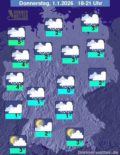 Heute Abend zieht überwiegend dichte Bewölkung übers Land hinweg, lediglich im Süden ist der Himmel gebietsweise auch locker bis aufgelockert bewölkt, hier bleibt es auch meist trocken. Im großen Rest der Republik fällt hingegen zeitweise Regen, Schneeregen oder Schnee. Es besteht zum Teil erhebliche Glättegefahr! Die Temperatur liegt bei 0 Grad in Erfurt und bis 5 Grad in Cuxhaven.