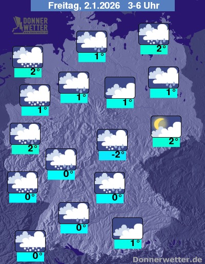 In der Nacht zum Freitag bleibt der Himmel weitgehend bedeckt und Auflockerungen bleiben selten. Im Südosten und über Sachsen bleibt es meist trocken, sonst fällt gebietsweise Regen, Schneeregen oder Schnee. Es besteht weiterhin teils erhebliche Glättegefahr durch Schnee oder gefrierende Nässe! Die Tiefstwerte liegen bei 2 Grad im Rheinland und bis -2 Grad im Vogtland.