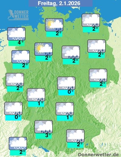 Am Freitag ziehen oft dichte Wolken durch, vor allem im Norden sich dabei auf mal Auflockerungen möglich. Es bilden sich landesweit wiederholt Schnee- und Graupelschauer. Im Nordwesten treten auch regional auch kurze Gewitter auf. Die Höchstwerte liegen bei 0 Grad im Grabfeld und bis 4 Grad an der Nordsee. Es ist verbreitet windig mit stürmischen Böen. An der See herrscht verbreitet Sturm mit zum Teil schweren Sturmböen!