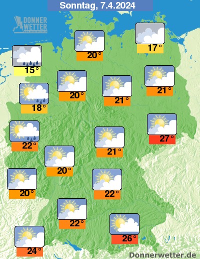 Am Sonntag ist es über der Südosthälfte Deutschlands noch meist heiter und auch trocken. Im übrigen Bundesgebiet ist es aufgelockert oder stark bewölkt, dazu sind auch einzelne Schauer möglich. Die Temperatur erreicht nur noch 15 Grad an der Nordsee und bis 27 Grad in der Lausitz.