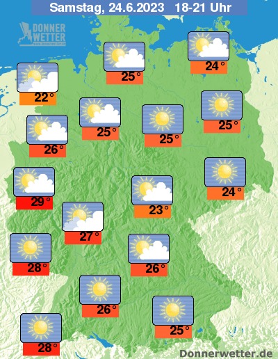 Am Sonntag scheint die Sonne über dem Land von einem mehrheitlich wolkenlosen Himmel. Hier und da, vor allem aber im Nordosten können zum Teil dichte Quellwolken aufziehen, Schauer bleiben aber äußerst selten. Die Temperatur steigt auf 24 Grad in Cuxhaven und bis 32 Grad in Köln.