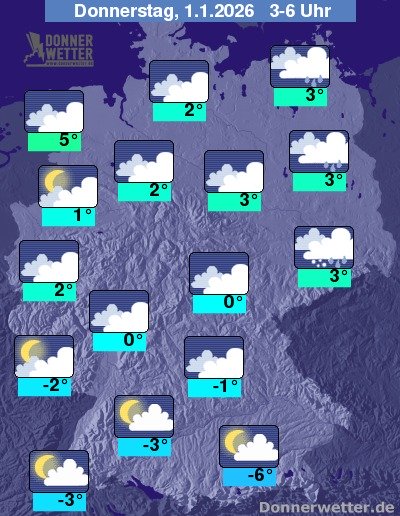 In der Nacht zum Donnerstag ziehen die Niederschläge immer weiter nach Osten und Südosten hin ab, dahinter ist hier und da noch etwas Regen oder Schnee möglich. Zumeist bleibt es bei dichter Bewölkung aber trocken. Vor allem im Süden lockert der Himmel häufig auf. Die Temperatur sinkt auf 5 Grad an der Nordsee und bis -6 Grad in Oberbayern. Im Norden weht ein zunehmend starker und teils stürmischer Wind. An der Nordsee herrscht zunehmend Sturm.
