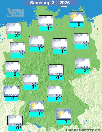 Heute zeigt sich der Süden oft heiter und trocken. Im übrigen Bundesgebiet zieht hingegen oft starke, zum Teil auch noch aufgelockerte Bewölkung durch, dabei bilden sich gebietsweise Schneeschauer, zum Teil mischt sich auch Regen oder Schneeregen in die Niederschläge. Die Höchstwerte liegen bei -1 Grad im Eichsfeld und bis 3 Grad an der Elbmündung. An der See weht ein oft stürmischer Wind.