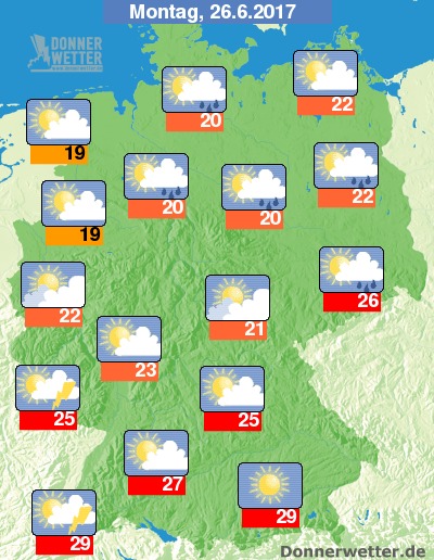 Die Temperaturen erreichen Werte um 19 Grad C im Emsland und um 29 Grad C am Oberrhein.