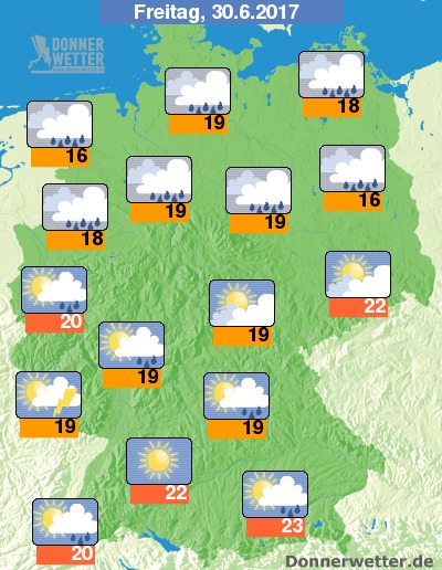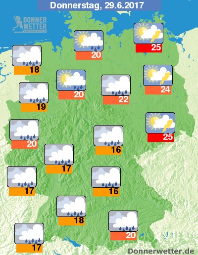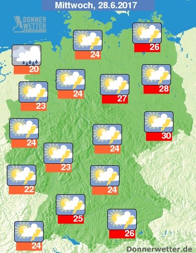 Erhöhtes Gewitter- / Unwetterrrisiko in den meisten Landesteilen dann am Mittwoch - die Temperaturen erreichen dabei angenehme 20 Grad C in Ostfriesland und schwül-heiße 30 Grad C in Dresden.