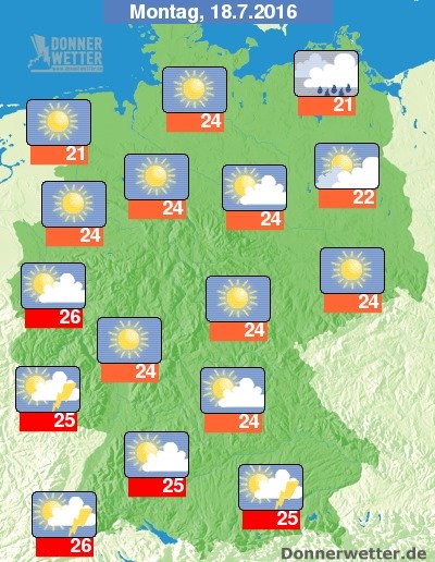Am Montag ist es im Süden neben heiteren Abschnitte auch oft stark bewölkt und es können sich sowohl Schauer als auch Gewitter entwickeln. Im übrigen Bundesgebiet scheint hingegen häufig die Sonne bei oft nur lockeren Wolken und teils auch wolkenlosem Himmel. Einzelne Schauer sind jedoch an der Ostsee möglich, sonst bleibt es trocken. Die Temperatur steigt auf 21 Grad in Stralsund und 26 Grad am Oberrhein.