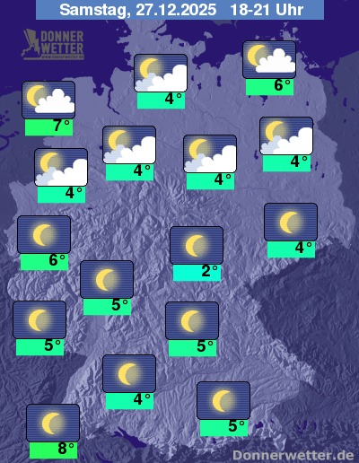 In der Nacht zum Sonntag halten sich vor allem über der Landesmitte, anfangs auch im Norden noch einige, zum Teil auch dichte Wolken. Sonst ist der Himmel jedoch überwiegend nur locker bewölkt oder sternenklar. Es bleibt landesweit trocken bei Tiefstwerten von 1 Grad an der Nordsee und bis -6 Grad im Raum München.
