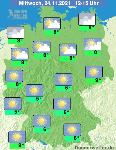 Heute Nachmittag ist es vor allem über der Südhälfte Deutschlands verbreitet sonnig, hier und da können sich noch Nebelfelder halten. Im Norden des Landes ist es jedoch meist stark bewölkt, Auflockerungen sind aber auch hier möglich. Es bleibt landesweit trocken bei Höchstwerten von 5 Grad am Pfälzer Wald und bis 9 Grad in der Lausitz.